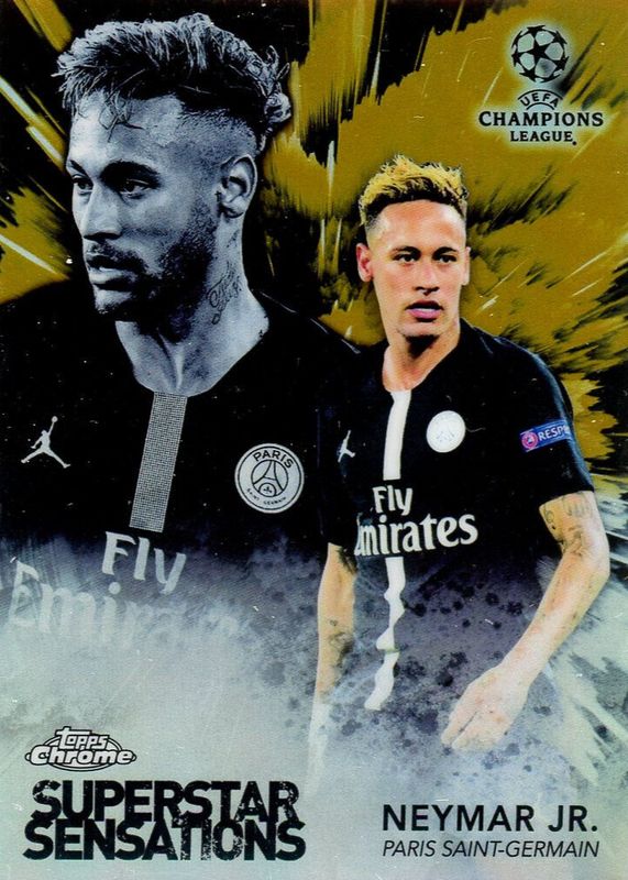 The Neymar Jr. 2018 Topps Chrome UEFA Champions League #SS-NJ Superstar Sensations - Gold Refractor /50 card in Raw condition has not changed in price in the last 30 days and was last sold for $9.50 .