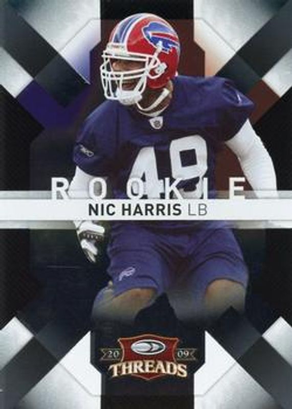 The Nic Harris 2009 Donruss Threads #176 Base /275 Rookie card is 1 of 7 Nic Harris' card variations in the 2009 Donruss Threads set being tracked by Sports Card Investor, including Retail Red, Retail Rookies /999, Silver Holofoil /250, Retail Green /100, and Gold Holofoil /50.