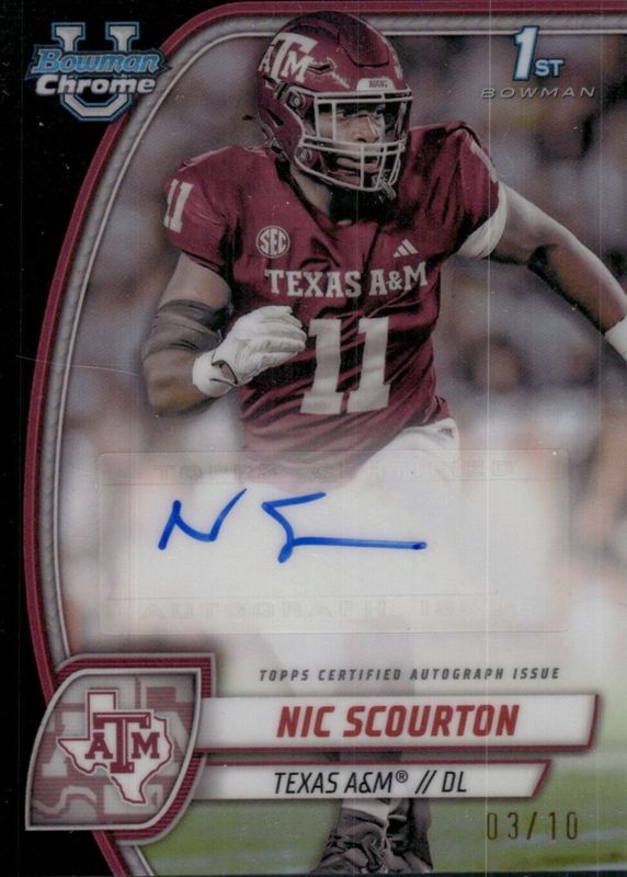This card is 1 of 14 Nic Scourton's card variations in the 2024 Bowman Chrome University set being tracked by Sports Card Investor, including Prospect Auto (1st), Prospect Auto - Stealth Refractor (1st), Prospect Auto - Refractor /299 (1st), Prospect Auto - Fuchsia Refractor /150 (1st), and Prospect Auto - Green Refractor /99 (1st).