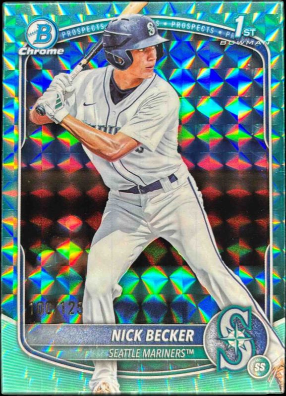 The Nick Becker 2025 Bowman Draft #BDC-100 Chrome - Aqua Geometric Refractor /125 card is 1 of 86 Nick Becker's card variations in the 2025 Bowman Draft set being tracked by Sports Card Investor, including Base, Chrome, Chrome - Lazer Refractor, Chrome - Refractor, and Chrome - Sky Blue Refractor.