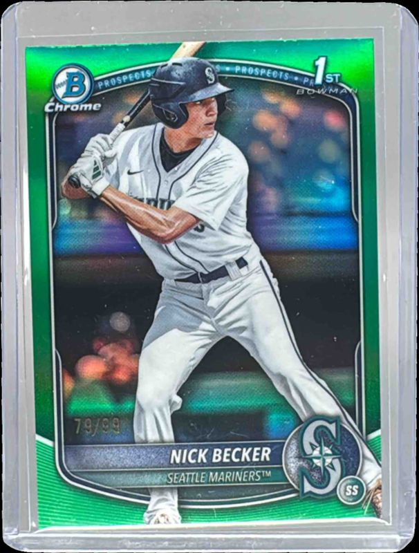 The Nick Becker 2025 Bowman Draft #BDC-100 Chrome - Green Refractor /99 card is 1 of 86 Nick Becker's card variations in the 2025 Bowman Draft set being tracked by Sports Card Investor, including Base, Chrome, Chrome - Lazer Refractor, Chrome - Refractor, and Chrome - Sky Blue Refractor.