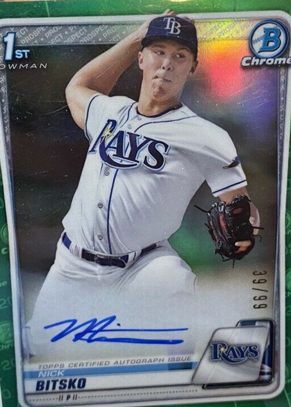 The Nick Bitsko 2020 Bowman Draft #CDA-NB Chrome DP Auto - Green Refractor /99 (1st) card in Raw condition has not changed in price in the last 30 days and was last sold for $26.00 .