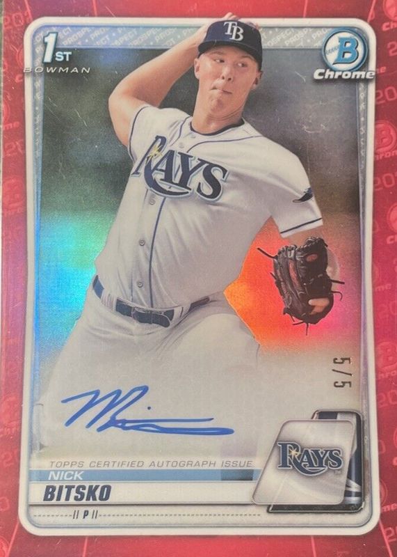 The Nick Bitsko 2020 Bowman Draft #CDA-NB Chrome DP Auto - Red Refractor /5 (1st) card in Raw condition has not changed in price in the last 30 days and was last sold for $51.00 .