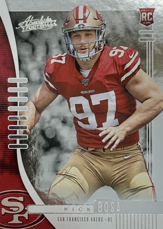 The Nick Bosa 2019 Absolute #131 Base Rookie card in Raw condition has moved up $0.91 (+60.7%) in the last 30 days and was last sold for $2.41 .
