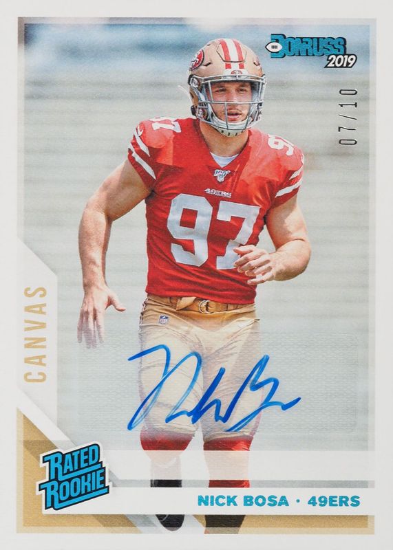 The Nick Bosa 2019 Donruss #318 Rated Rookie Autographs - Canvas /10 card in Raw condition has not changed in price in the last 30 days and was last sold for $150.00 .