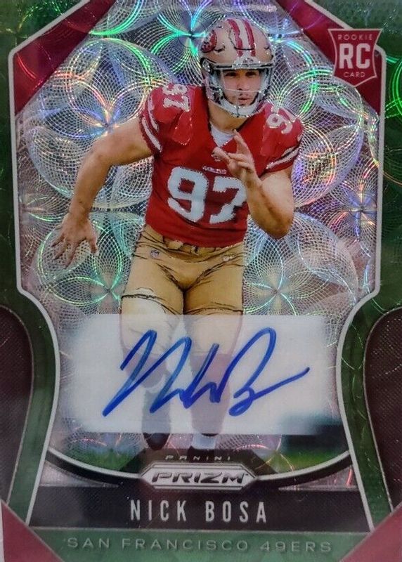 The Nick Bosa 2019 Prizm #311 Rookie Autographs - Green Scope /75 card in Raw condition has not changed in price in the last 30 days and was last sold for $115.48 .