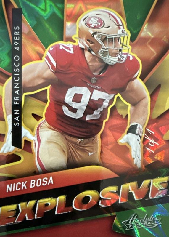 This card is 1 of 3 Nick Bosa's card variations in the 2021 Absolute set being tracked by Sports Card Investor, including Explosive /(SSP), and Explosive - Gold /10.