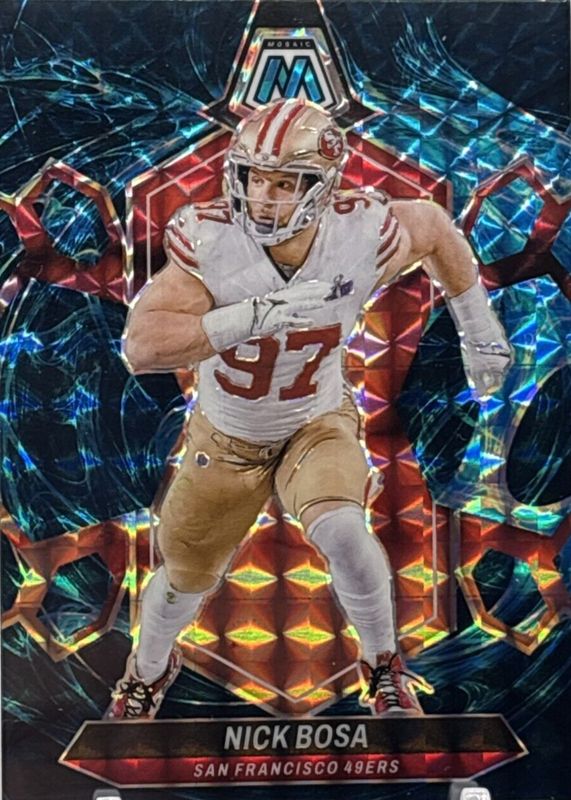 This card is 1 of 16 Nick Bosa's card variations in the 2024 Mosaic set being tracked by Sports Card Investor, including Choice Peacock /(SSP), Honeycomb /(SSP), Red Sparkle /(SSP), White Sparkle /(SSP), and Gold /10.