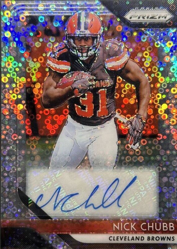 The Nick Chubb 2018 Prizm #RA-NC Rookie Autographs - Disco card in Raw condition has not changed in price in the last 30 days and was last sold for $114.50 .