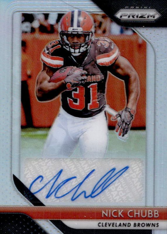 The Nick Chubb 2018 Prizm #RA-NC Rookie Autographs card in Raw condition has moved down -$5.00 (-9.1%) in the last 30 days and was last sold for $50.00 .
