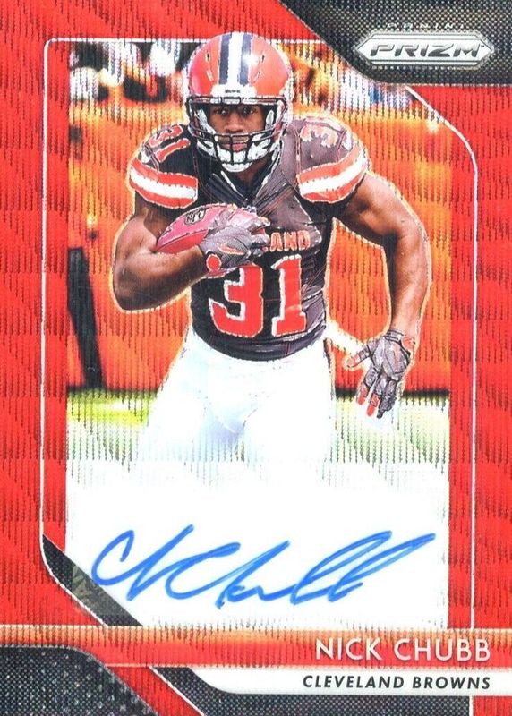 The Nick Chubb 2018 Prizm #RA-NC Rookie Autographs - Red Wave (/199) card in Raw condition has not changed in price in the last 30 days and was last sold for $47.00 .
