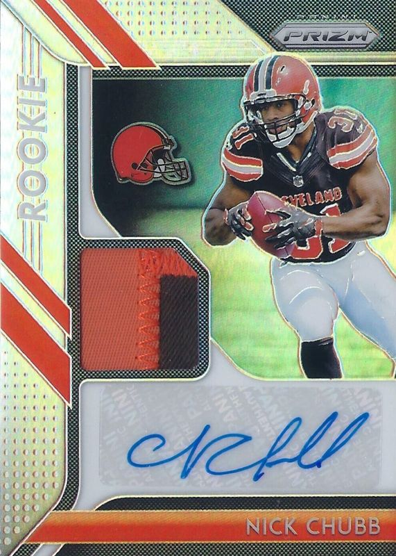 The Nick Chubb 2018 Prizm #RPA-NC Rookie Patch Auto /99 card in Raw condition has not changed in price in the last 30 days and was last sold for $64.89 .