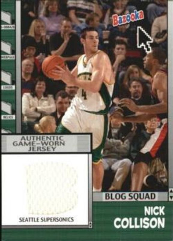 The Nick Collison 2005 Bazooka #BBS-NC Blog Squad Relics card is 1 of 6 Nick Collison's card variations in the 2005 Bazooka set being tracked by Sports Card Investor, including Base, Gold, Minis, Blue /5, and Tattoos.