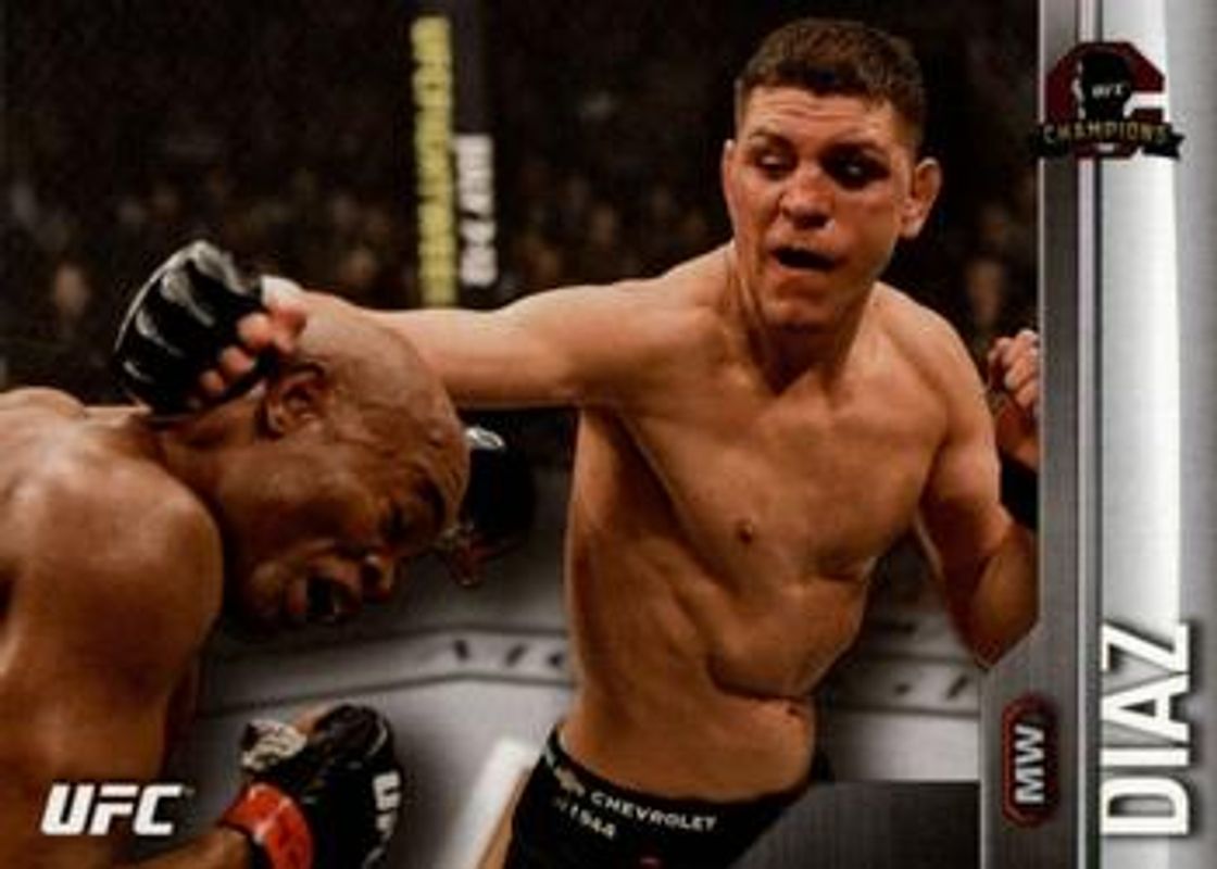 The Nick Diaz 2015 Topps UFC Champions #106 Base card is 1 of 10 Nick Diaz's card variations in the 2015 Topps UFC Champions set being tracked by Sports Card Investor, including Silver, Black /188, Blue /88, Gold /25, and Red /8.