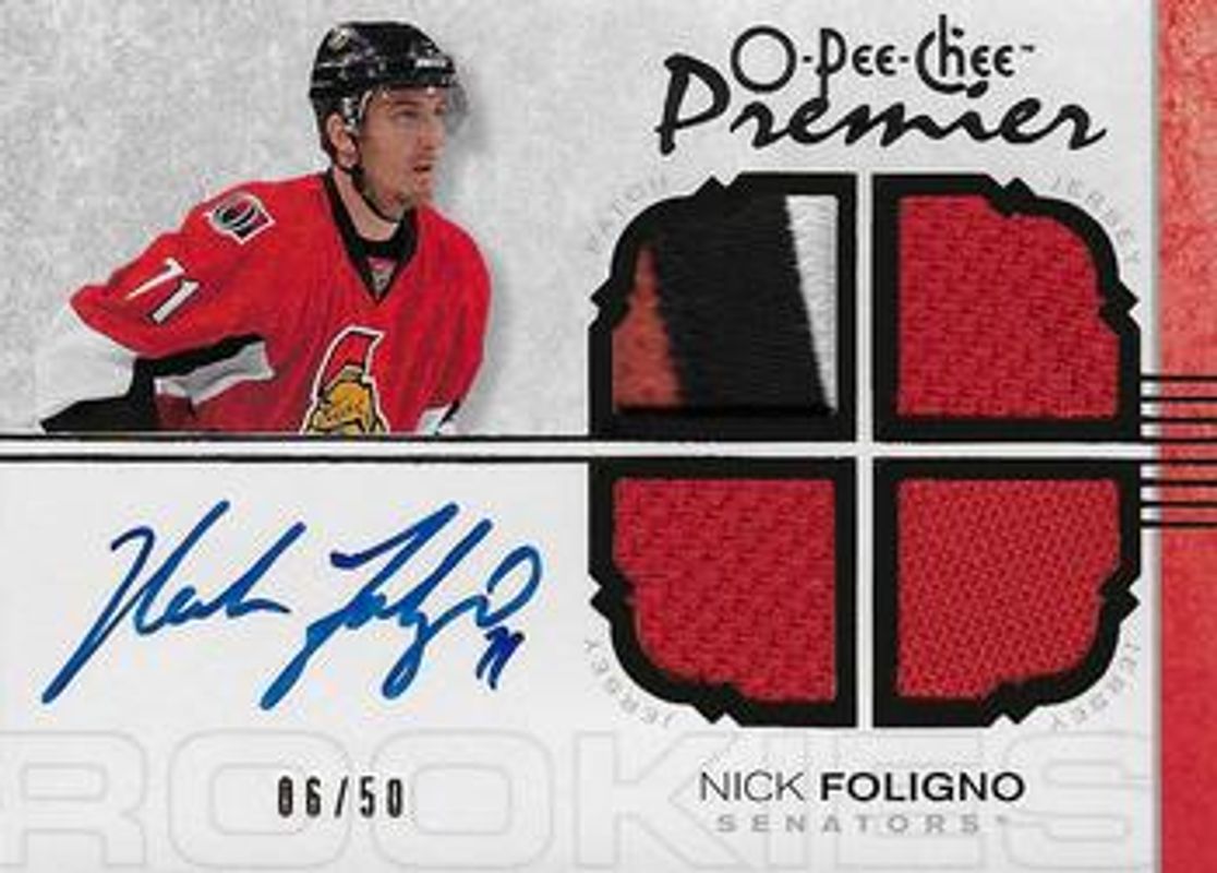 The Nick Foligno 2007 O-Pee-Chee Premier #140 Gold /50 Rookie card is 1 of 5 Nick Foligno's card variations in the 2007 O-Pee-Chee Premier set being tracked by Sports Card Investor, including Base /299, Silver Spectrum /35, Gold Spectrum /15, and Black /1.