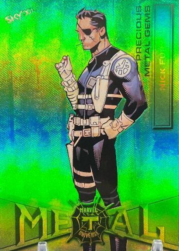 Nick Fury 2021 Skybox Marvel Metal Universe Spider-Man #61 Precious Metal Gems Green /10 RAW Price Guide