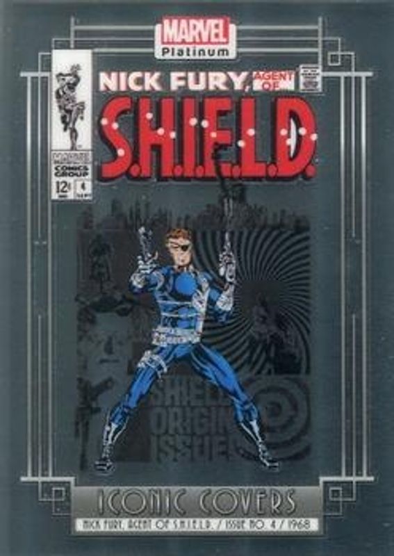 The Nick Fury 2023 Upper Deck Marvel Platinum #IC19 Iconic Covers card is 1 of 44 Nick Fury's card variations in the 2023 Upper Deck Marvel Platinum set being tracked by Sports Card Investor, including Base, Black Rainbow, Blue Rainbow, Blue Surge, and Purple Rainbow.