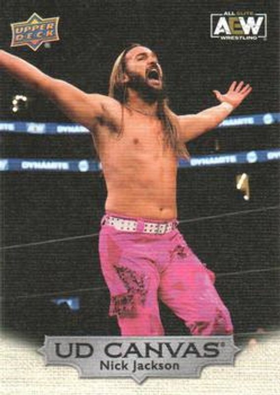 The Nick Jackson 2022 Upper Deck AEW #C38 UD Canvas card is 1 of 34 Nick Jackson's card variations in the 2022 Upper Deck AEW set being tracked by Sports Card Investor, including Base, Gold, Pyro, Silver Foil, and Green Pyro /399.