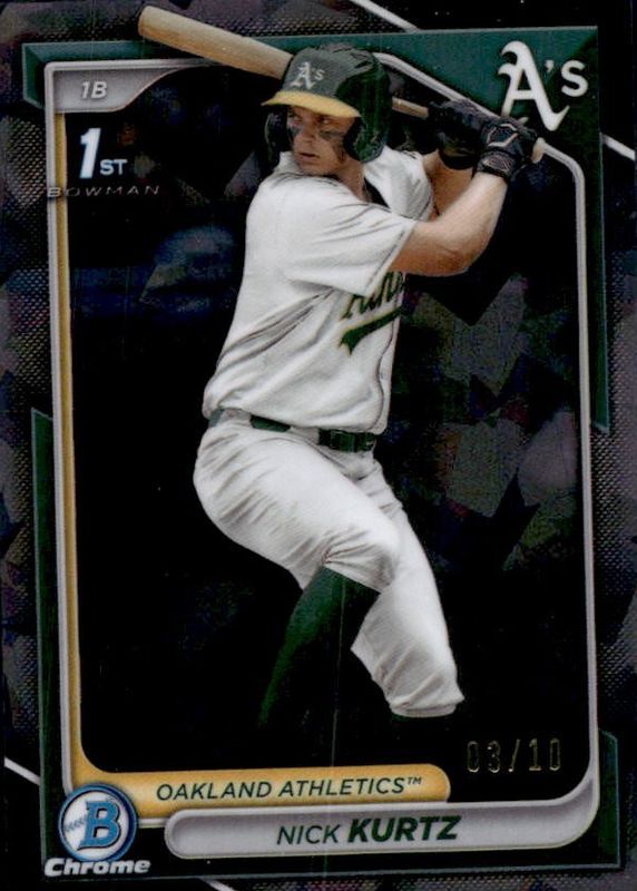 The Nick Kurtz 2024 Bowman Draft Sapphire Edition #BDC-56 Chrome - Black /10 (1st) card in Raw condition has not changed in price in the last 30 days and was last sold for $620.00 .