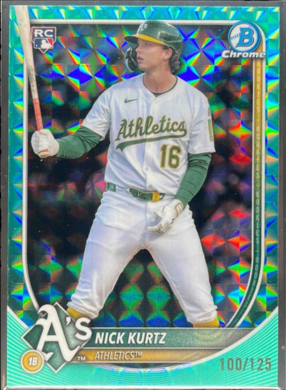 The Nick Kurtz 2025 Bowman Chrome #93 Aqua Geometric Refractor /125 Rookie card is 1 of 90 Nick Kurtz's card variations in the 2025 Bowman Chrome set being tracked by Sports Card Investor, including Base, Geometric Refractor /499, Refractor /499, Pulsar Refractor /399, and Fuchsia Refractor /299.