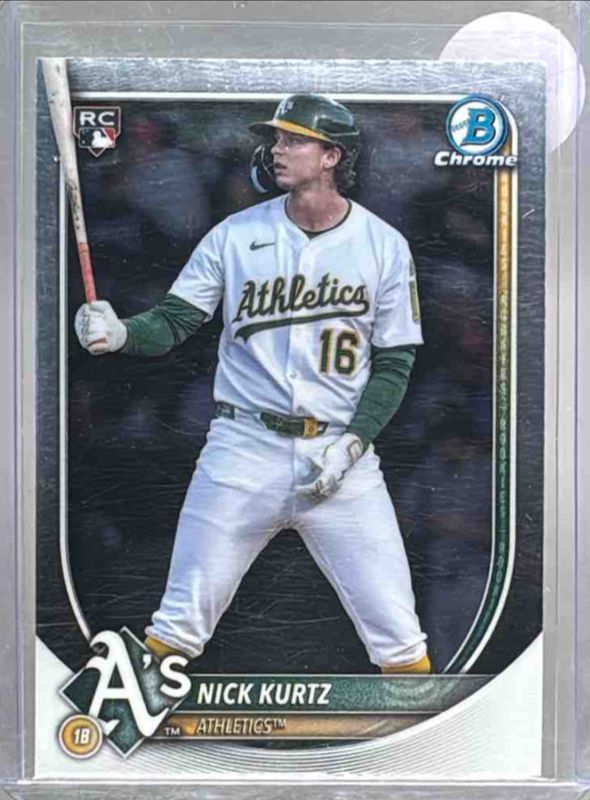 The Nick Kurtz 2025 Bowman Chrome #93 Base Rookie card is 1 of 90 Nick Kurtz's card variations in the 2025 Bowman Chrome set being tracked by Sports Card Investor, including Geometric Refractor /499, Refractor /499, Pulsar Refractor /399, Fuchsia Refractor /299, and Fuchsia Wave Refractor /299.