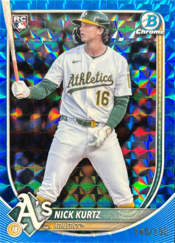 The Nick Kurtz 2025 Bowman Chrome #93 Blue Geometric Refractor /150 Rookie card is 1 of 90 Nick Kurtz's card variations in the 2025 Bowman Chrome set being tracked by Sports Card Investor, including Base, Geometric Refractor /499, Refractor /499, Pulsar Refractor /399, and Fuchsia Refractor /299.