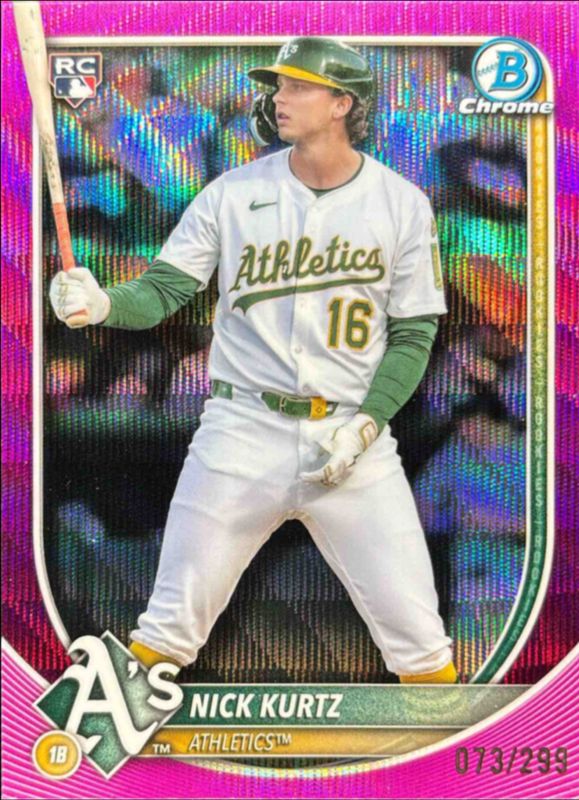 The Nick Kurtz 2025 Bowman Chrome #93 Fuchsia Wave Refractor /299 Rookie card is 1 of 90 Nick Kurtz's card variations in the 2025 Bowman Chrome set being tracked by Sports Card Investor, including Base, Geometric Refractor /499, Refractor /499, Pulsar Refractor /399, and Fuchsia Refractor /299.