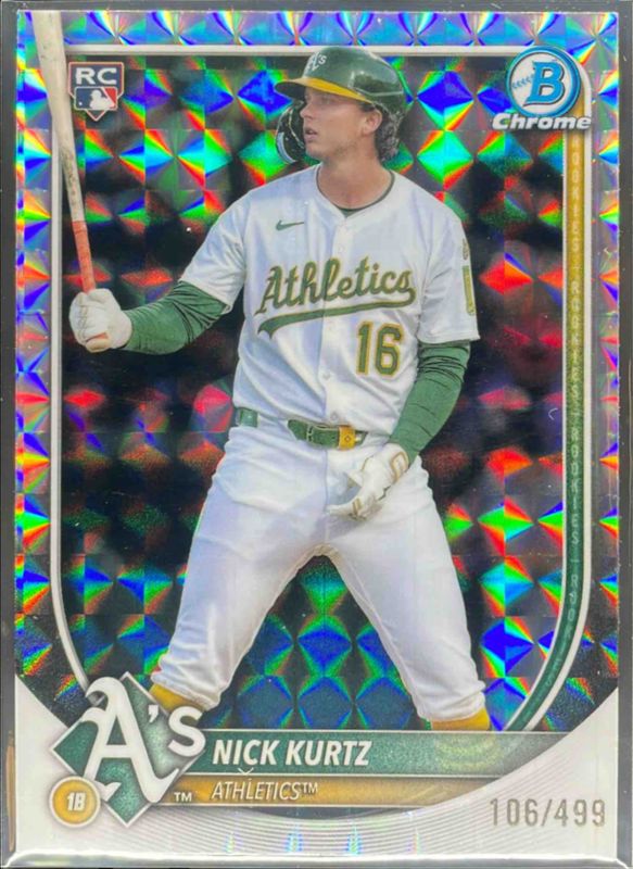 The Nick Kurtz 2025 Bowman Chrome #93 Geometric Refractor /499 Rookie card is 1 of 90 Nick Kurtz's card variations in the 2025 Bowman Chrome set being tracked by Sports Card Investor, including Base, Refractor /499, Pulsar Refractor /399, Fuchsia Refractor /299, and Fuchsia Wave Refractor /299.