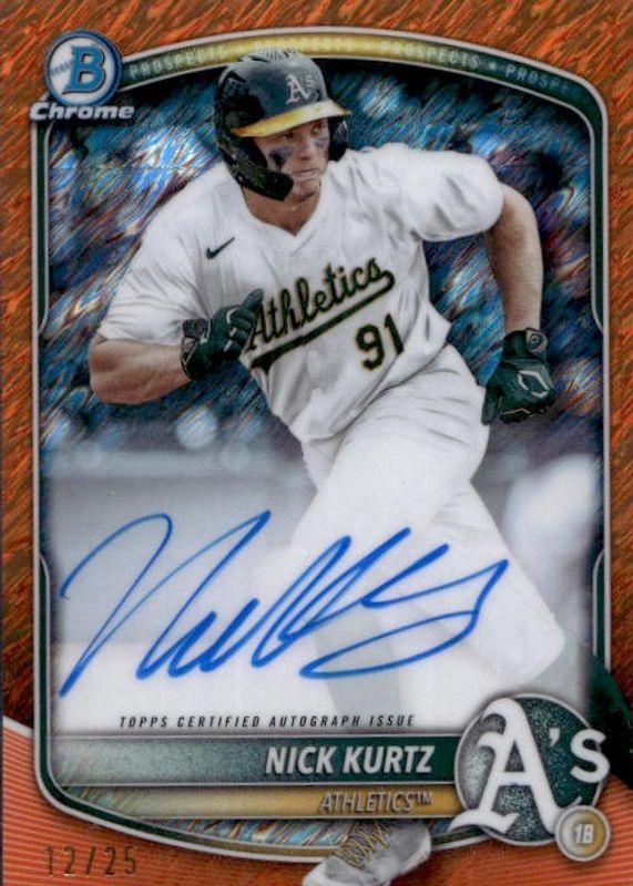 The Nick Kurtz 2025 Bowman #CPA-NK Chrome Prospect Auto - Orange Shimmer Refractor /25 Rookie card in Raw condition has not changed in price in the last 30 days and was last sold for $925.00 .