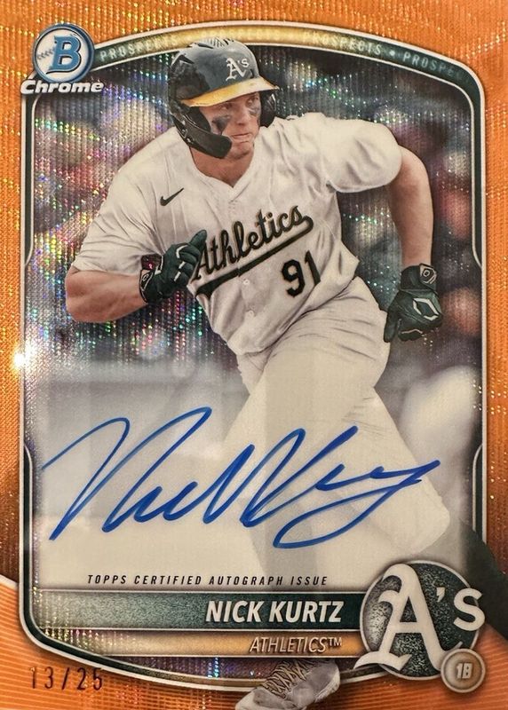 The Nick Kurtz 2025 Bowman #CPA-NK Chrome Prospect Auto - Orange Wave Refractor /25 Rookie card in Raw condition has not changed in price in the last 30 days and was last sold for $636.00 .