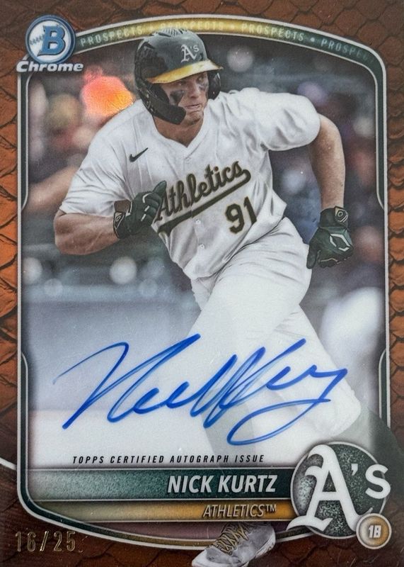 The Nick Kurtz 2025 Bowman #CPA-NK Chrome Prospect Auto - Reptilian Orange Refractor /25 Rookie card in Raw condition has not changed in price in the last 30 days and was last sold for $820.00 .