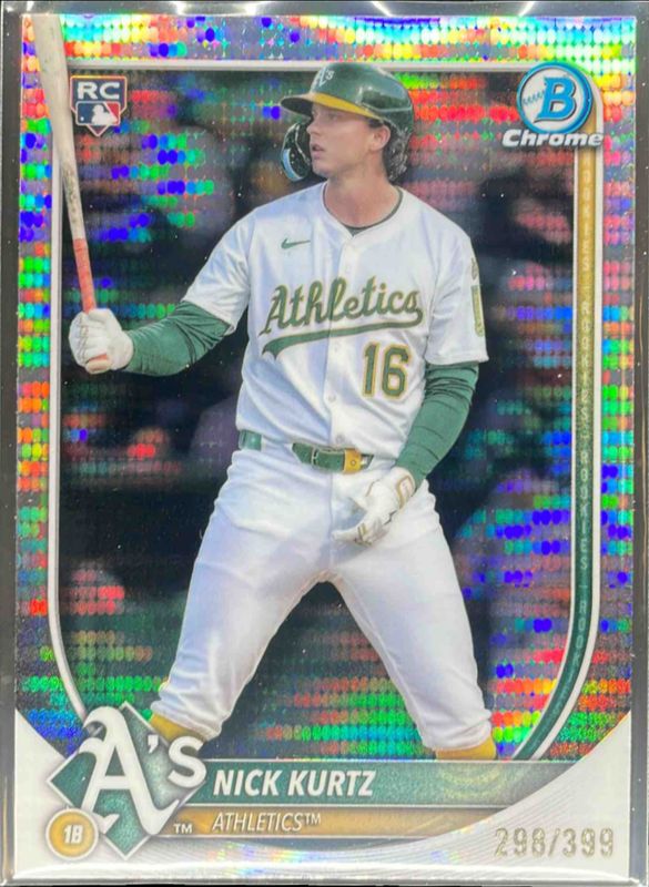 The Nick Kurtz 2025 Bowman Chrome #93 Pulsar Refractor /399 Rookie card is 1 of 90 Nick Kurtz's card variations in the 2025 Bowman Chrome set being tracked by Sports Card Investor, including Base, Geometric Refractor /499, Refractor /499, Fuchsia Refractor /299, and Fuchsia Wave Refractor /299.