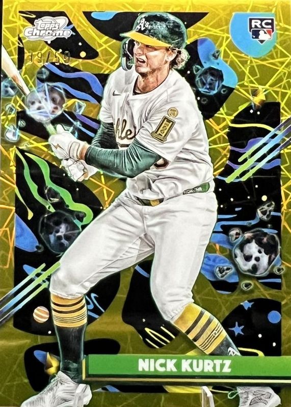 The Nick Kurtz 2025 Topps Chrome Cosmic #183 Gold Interstellar Refractor /50 Rookie card in Raw condition has moved down -$25.01 (-11.0%) in the last 30 days and was last sold for $202.49 .