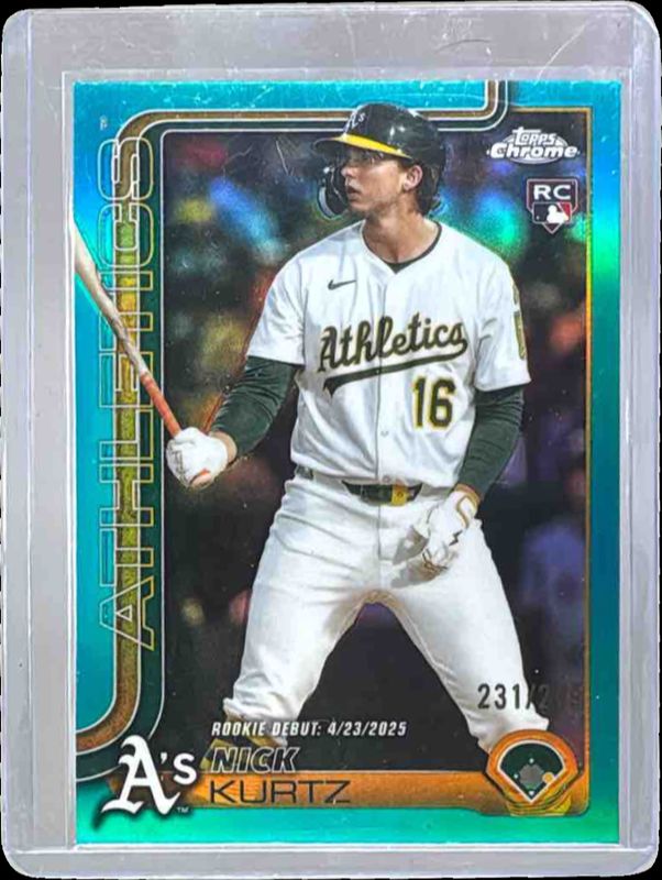 The Nick Kurtz 2025 Topps Chrome Update #USC180 Teal Refractor /299 Rookie card is 1 of 217 Nick Kurtz's card variations in the 2025 Topps Chrome Update set being tracked by Sports Card Investor, including #USC178 Base, #USC180 Base, #USC178 Image Variation, #USC180 Rookie Debut, and #USC178 Geometric Refractor.