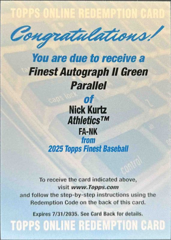 The Nick Kurtz 2025 Topps Finest #FA-NK Finest Autographs - Green Refractor /75 Rookie card is 1 of 79 Nick Kurtz's card variations in the 2025 Topps Finest set being tracked by Sports Card Investor, including Common, Rare, Common - Checkerboard Refractor, Common - Refractor, and Rare - Checkerboard Refractor.