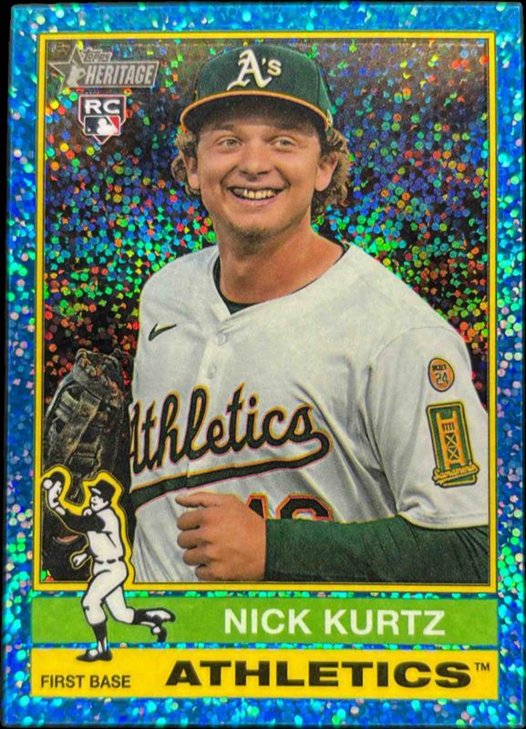 The Nick Kurtz 2025 Topps Heritage High Number #706 Chrome Short Print - Light Blue Sparkle Refractor Rookie card is 1 of 26 Nick Kurtz's card variations in the 2025 Topps Heritage High Number set being tracked by Sports Card Investor, including Alternate Cartoon Variation, Chrome SP Variation, Flipped Bat Variation, Flip Stock, and Image Variation.