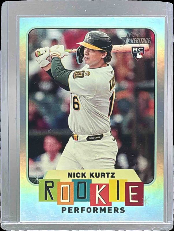 The Nick Kurtz 2025 Topps Heritage High Number #RP-7 Rookie Performers - Holographic card is 1 of 26 Nick Kurtz's card variations in the 2025 Topps Heritage High Number set being tracked by Sports Card Investor, including Alternate Cartoon Variation, Chrome SP Variation, Flipped Bat Variation, Flip Stock, and Image Variation.