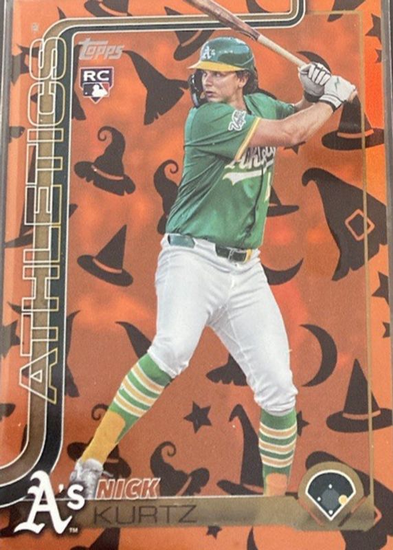 The Nick Kurtz 2025 Topps Update #US201 Holiday Witches Hat /5 Rookie card in Raw condition has not changed in price in the last 30 days and was last sold for $450.00 .