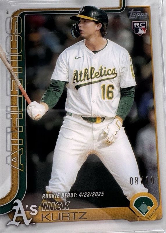 The Nick Kurtz 2025 Topps Update #US197 Rookie Debut - Clear Variation /10 card in Raw condition has not changed in price in the last 30 days and was last sold for $1,100.00 .