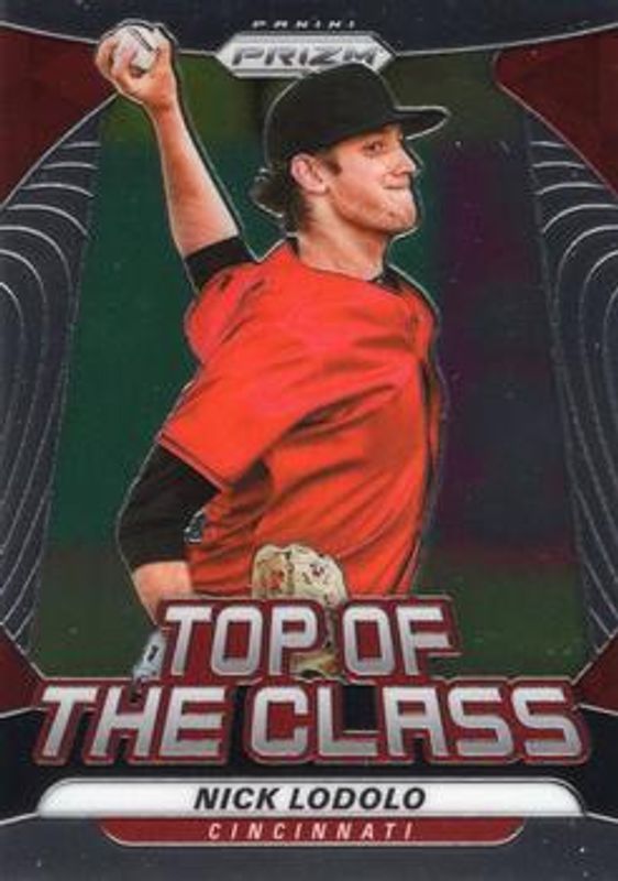 The Nick Lodolo 2020 Prizm #TOC-7 Top of the Class card is 1 of 5 Nick Lodolo's card variations in the 2020 Prizm set being tracked by Sports Card Investor, including Top of The Class - Silver, Top of The Class - Gold /10, Top of The Class - Black Finite /1, and Top of The Class - Gold Vinyl /1.