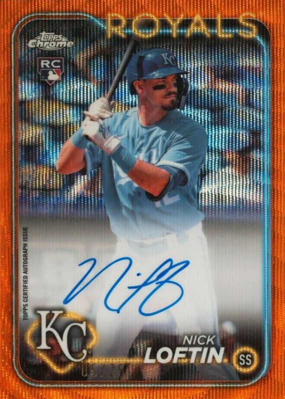 The Nick Loftin 2024 Topps Chrome #RA-NL Rookie Autographs - Orange Wave Refractor /25 card in Raw condition has not changed in price in the last 30 days and was last sold for $9.99 .