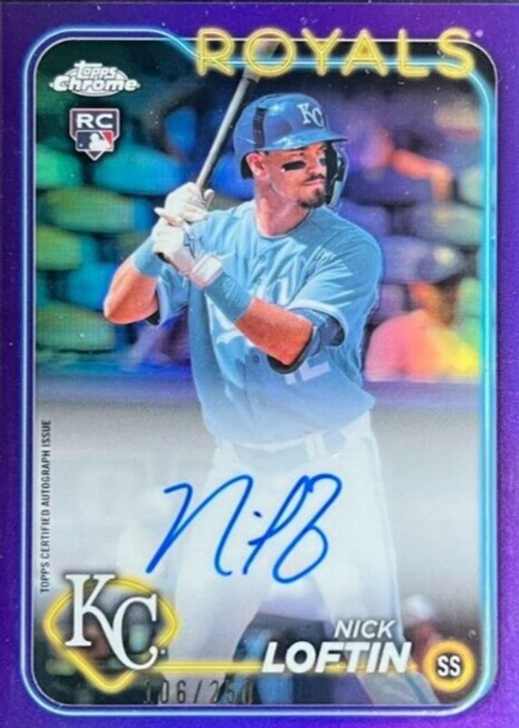 The Nick Loftin 2024 Topps Chrome #RA-NL Rookie Autographs - Purple Refractor /250 card in Raw condition has not changed in price in the last 30 days and was last sold for $2.55 .
