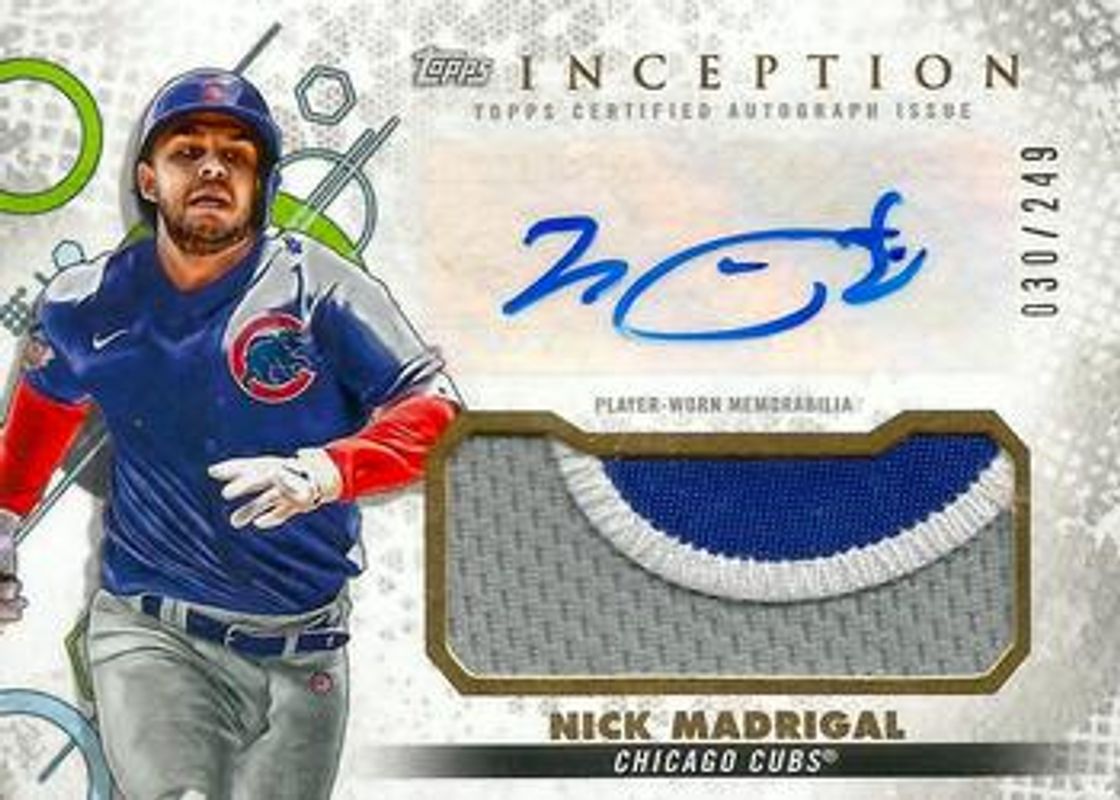 The Nick Madrigal 2022 Topps Inception #IAP-NM Autographs - Patch /249 card is 1 of 16 Nick Madrigal's card variations in the 2022 Topps Inception set being tracked by Sports Card Investor, including Rookie & Emerging Stars Autographs /299, Rookie & Emerging Stars Autographs - Green /125, Autographs Patch - Green /99, Rookie & Emerging Stars Autographs - Magenta /99, and Autographs Patch - Magenta /75.