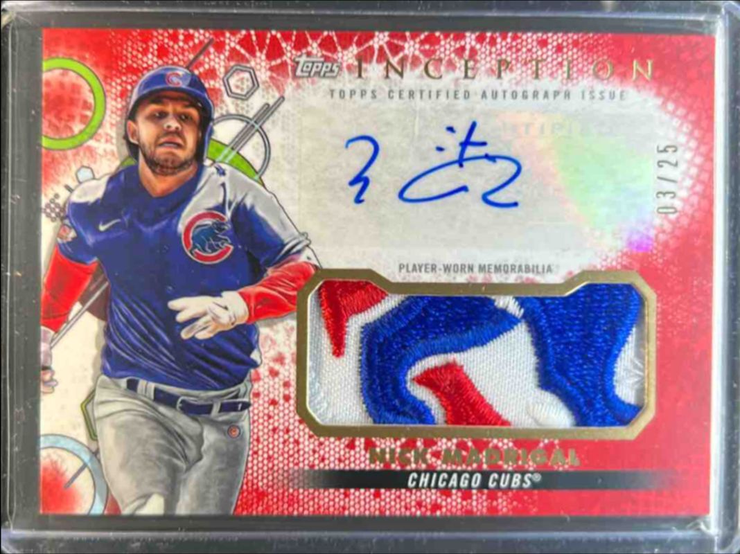 The Nick Madrigal 2022 Topps Inception #IAP-NM Autographs Patch - Red /25 card is 1 of 16 Nick Madrigal's card variations in the 2022 Topps Inception set being tracked by Sports Card Investor, including Rookie & Emerging Stars Autographs /299, Autographs - Patch /249, Rookie & Emerging Stars Autographs - Green /125, Autographs Patch - Green /99, and Rookie & Emerging Stars Autographs - Magenta /99.