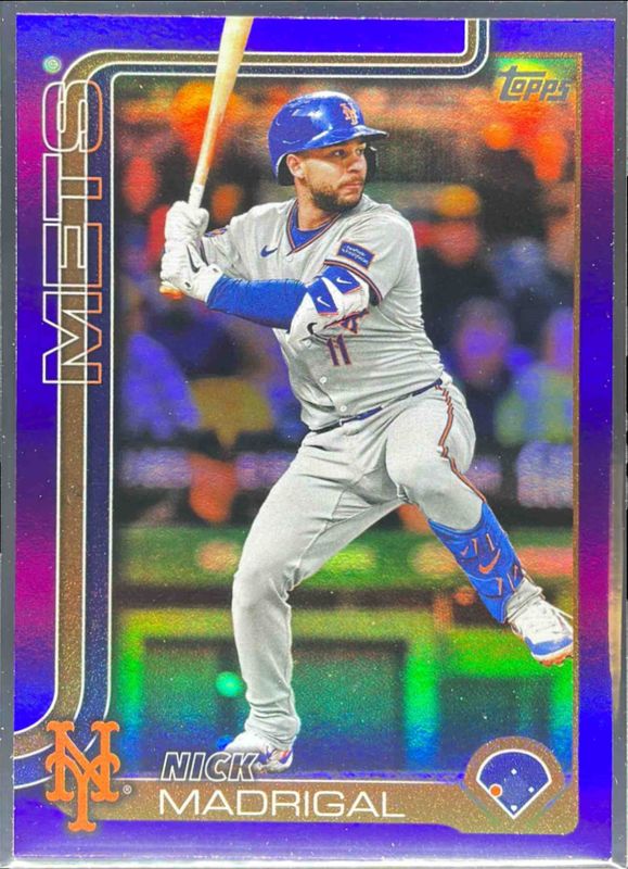 The Nick Madrigal 2025 Topps #355 Purple Rainbow /250 card is 1 of 56 Nick Madrigal's card variations in the 2025 Topps set being tracked by Sports Card Investor, including Base, Aqua Holo Foil, Diamante Foil, Holo Foil, and Pink Diamante Foil.