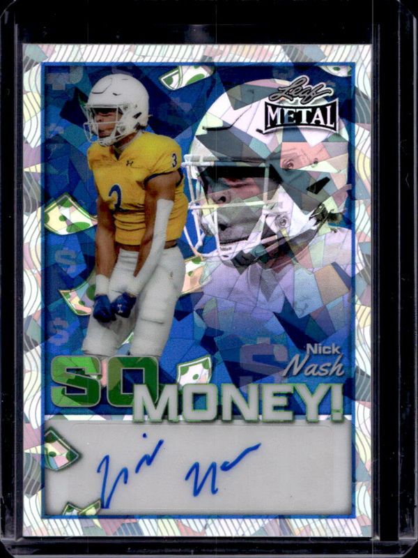 The Nick Nash 2025 Leaf Metal #SM-NN1 So Money! - Crystals Blue /8 card is 1 of 150 Nick Nash's card variations in the 2025 Leaf Metal set being tracked by Sports Card Investor, including Autographs - Laser Silver, 92 Leaf LGR Autographs - Prismatic Silver /25, Autographs - Prismatic Silver /25, So Money! - Prismatic Silver /25, and 92 Leaf LGR Autographs - Prismatic Blue /20.