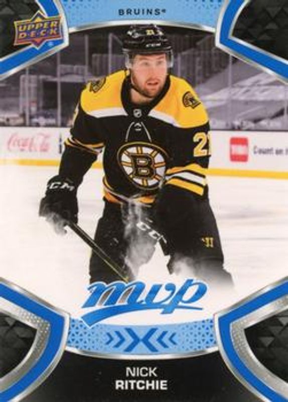 The Nick Ritchie 2021 Upper Deck MVP #60 Blue card is 1 of 12 Nick Ritchie's card variations in the 2021 Upper Deck MVP set being tracked by Sports Card Investor, including Base, Gold Script, Ice Battles, Silver Script, and Super Script /25.