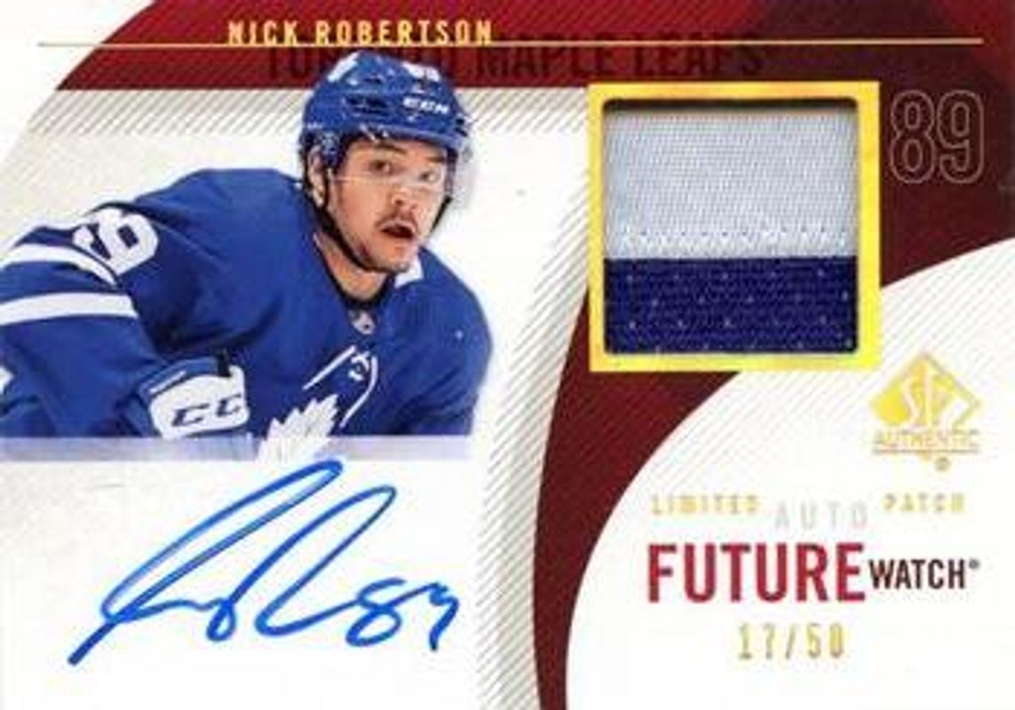 The Nick Robertson 2020 SP Authentic #RFWAP-NR 2010 Retro Future Watch Auto Patch /25 Rookie card is 1 of 13 Nick Robertson's card variations in the 2020 SP Authentic set being tracked by Sports Card Investor, including Base /999, Black Gold Ink, Future Watch Acetate, 2020 Upper Deck Young Guns Acetate, and Spectrum FX.