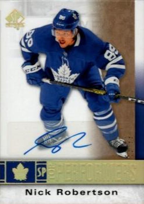The Nick Robertson 2020 SP Authentic #TP-NR Top Performers Autographs /10 Rookie card is 1 of 13 Nick Robertson's card variations in the 2020 SP Authentic set being tracked by Sports Card Investor, including Base /999, Black Gold Ink, Future Watch Acetate, 2020 Upper Deck Young Guns Acetate, and Spectrum FX.