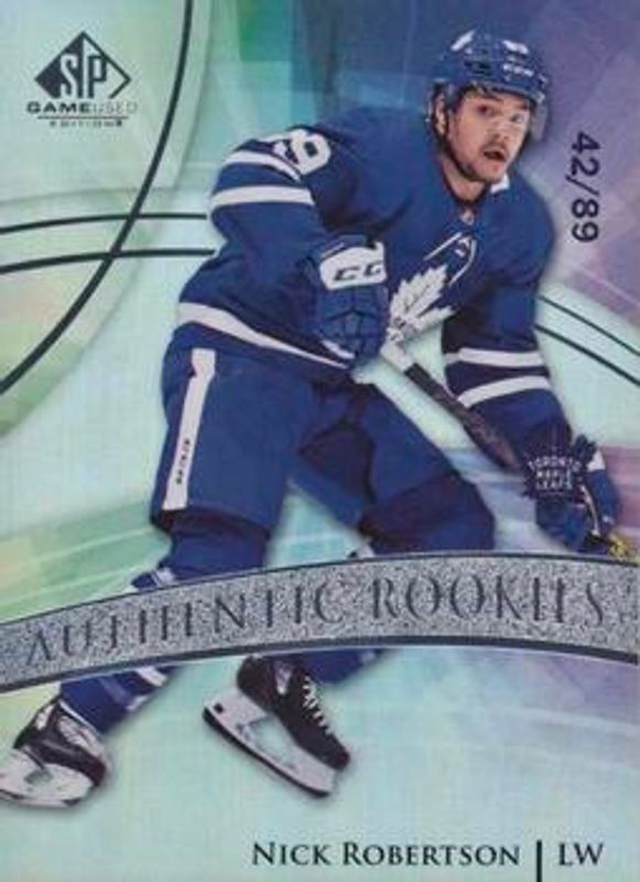The Nick Robertson 2020 SP Game Used #155 Base /31 Rookie card is 1 of 19 Nick Robertson's card variations in the 2020 SP Game Used set being tracked by Sports Card Investor, including Golden Burst /235, Blue Burst /135, Purple Burst /5, Green Burst /1, and Blue Autographs.